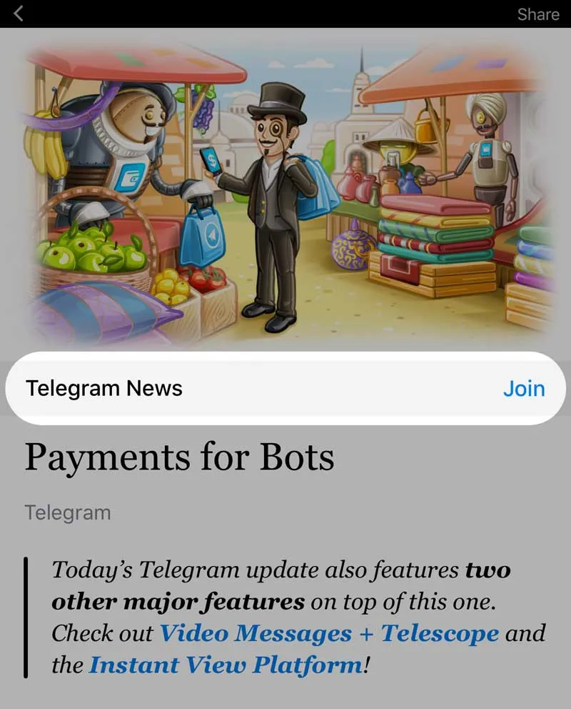 请注意,如果您将生成的t.me/iv?url=...&rhash=...链接发送给其他 Telegram 用户,他们将看到一个使用您的模板创建的即时预览页面(链接中的rhash参数决定了用于创建页面的模板)。这意味着,作为网站所有者,您可以为您的页面创建一个模板,并将t.me/iv?url=...带有相应rhash 的链接发布到您的 Telegram 频道——您的订阅者将能够立即以即时预览格式查看您的文章。